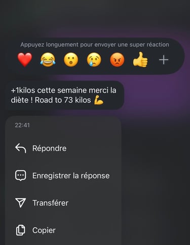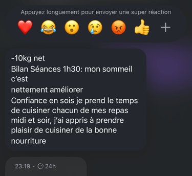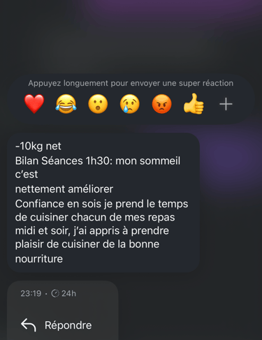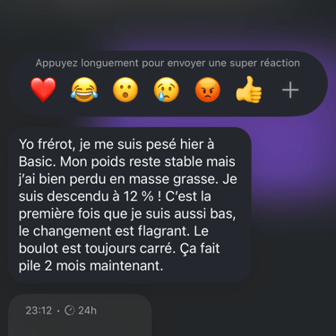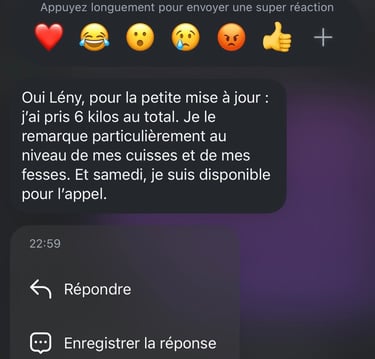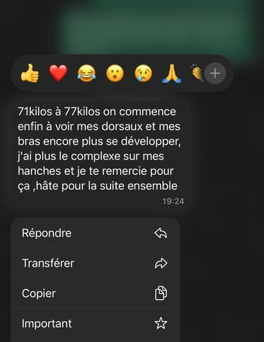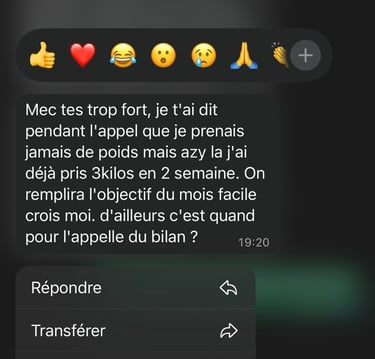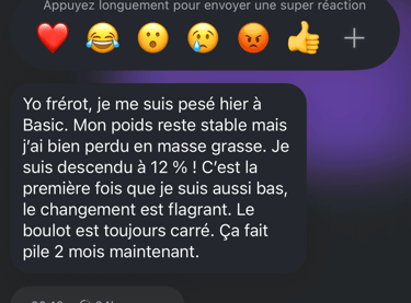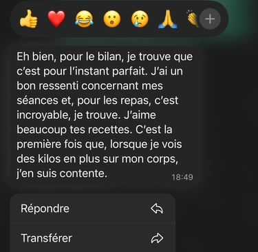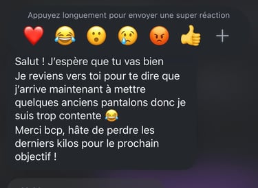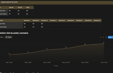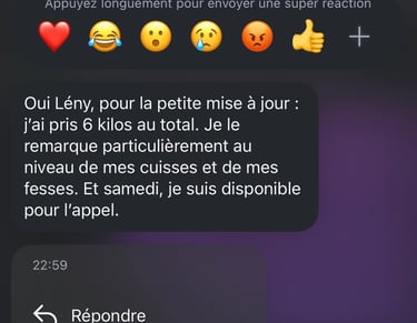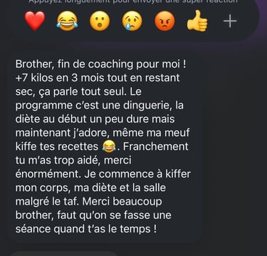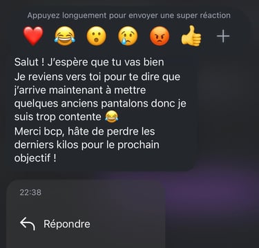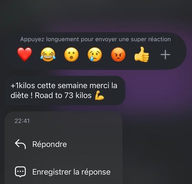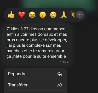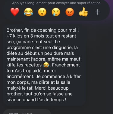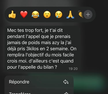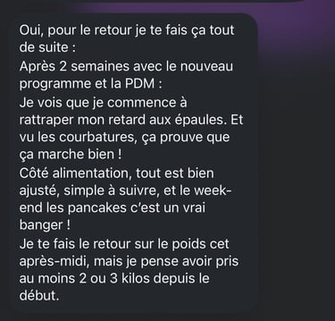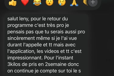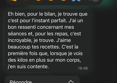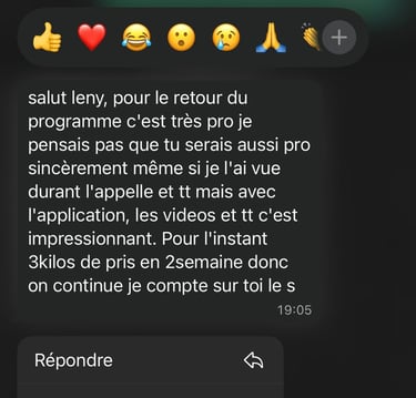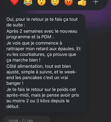 Un suivi constant, avec une disponibilité pour vous et vos questions. De plus, un graphique de votre évolution est mis à jour régulièrement par votre coach.